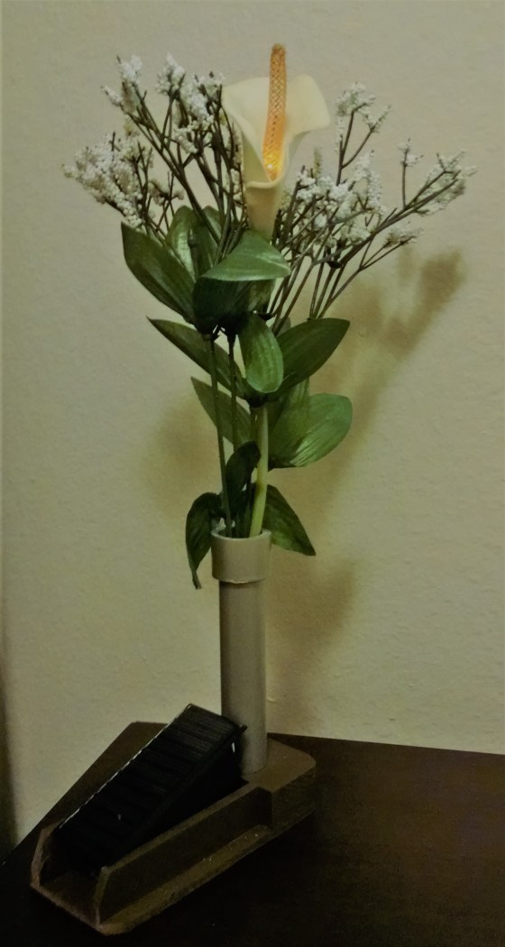 Phoenix Fire Lily: Solar rechargeable battery connected to a flickering LED inside an artificial lily flower residing in a hand-crafted wooden vase.